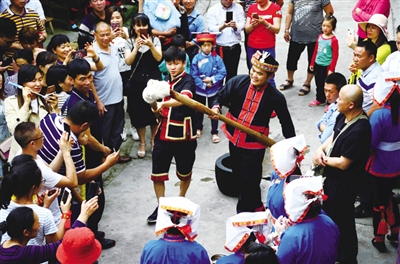 近年来,金秀通过打造“百里瑶寨风情画廊”乡村旅游带,发挥瑶族民俗文化特色和传统村落生态景观资源优势,逐步形成一村一品一特色的多元化乡村旅游发展格局,带动群众共享旅游发展红利,为民族传统文化和传统村落的传承与发展注入新的活力,助力乡村振兴。2018年,全县共接待游客557.43万人次,旅游总消费47.95亿元。2016年至2018年,通过旅游扶贫带动3905人实现脱贫。图为中国传统村落金秀瑶族自治县金秀镇六段瑶寨,“百里瑶寨风情画廊”乡村旅游现场。(高如金)