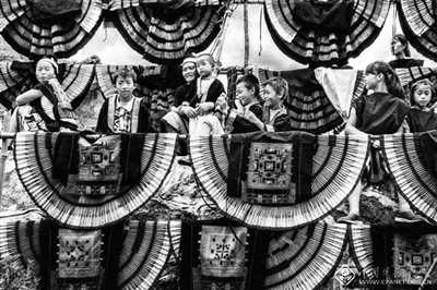 我们走到蜡染坊时,只见染坊门前围坐了近二十个白裤瑶阿娅,她们有的穿着民族服饰,有的穿着时髦的牛仔服、休闲服,认真忙碌着手中的针线活。白裤瑶阿娅精于纺织,至今仍保留着一套完整的手工制作技术。她们的一套服饰制作大概需要一年的时间,自己织布、纺纱、刺绣、画图案,总共需要三十多道工序。
