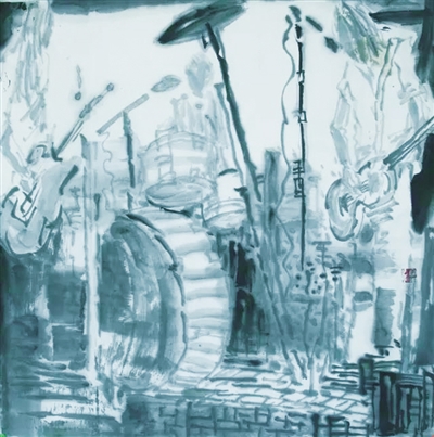 将音乐与国画结合,在展出国画作品时加入实物元素并现场播放自己创作的音乐作品,这种视听结合的国画作品形式十分少见,足以令人眼前一亮。