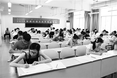 2019年度壮语文水平考试于7月28日上午在广西民族大学举行,来自区内南宁、柳州、防城港、钦州、贵港、贺州、百色、河池、来宾、崇左等10个市以及云南省文山州广南县的考生共464人参加了初、中、高三个等级的考试,是历年来参加考试人数最多的一次。