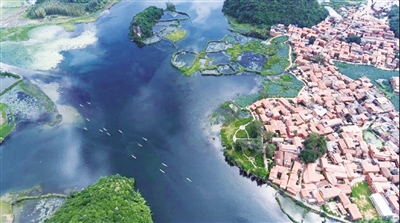 入夏的普者黑,是人间仙境。青峰悠远,湖泊交错,万亩荷花亭亭绽放,湖面穿行的游船激起一道道涟漪,错落有致的民居倒映水中……置身其中,仿佛走进了一幅艳丽的水彩画。