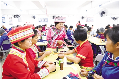 8月6日,在罗城仫佬族自治县谢成立仫佬刺绣服装厂,仫佬族妇女正在学习刺绣技艺。当日,罗城仫佬族自治县谢成立仫佬刺绣服装厂举行为期20天的岗前培训班,吸引该县易地扶贫搬迁安置新区“仫佬家园”“老乡家园”“凤凰寨”及周边群众共150多人集中学习平绣、剪纸绣、马尾绣等仫佬族刺绣技艺,力争通过学会一种技能,带富一个家庭。