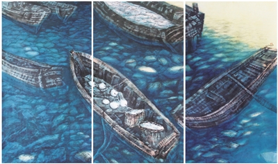 随着时间的流逝、社会的急速变迁,随着钟德阅历的增长、眼界的开阔,他画的海也在变。在创作实践上,从最初的“画得逼真,画得像”变成追求画出“味道”,“味道很重要,对了就几笔,不对味的话再抠也没用”,以往的表现经验在画水时都失效了,他慢慢构建起一套新的绘画语言。在创作理念上,从因思乡而画海转换为对过去具体环境人事的怀念,继而转为对水墨文化、对海洋生态的思考探索,“归根到底是人对社会变迁与转型的心灵自我修复行为”。