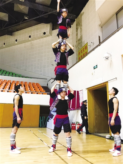 本报讯(记者 梁晴 实习生 罗超强 廖宗钰) 近日,记者来到广西科技师范学院体育馆内,表演项目《八仙舞》的18名参赛队员正在紧锣密鼓地训练着。只见场上8名队员戴着人面面具扮演着八仙,10名队员戴着兽面面具扮演“瘟神”和野兽,双方配合着极具瑶族特色的鼓点和山歌,你来我往“大战”了几百回合,连在场的记者都被带动了,也不禁跟着手舞足蹈了起来。18名参赛队员均为广西科技师范学院在校生,他们牺牲假期时间,通过训练不断地磨合动作,增加节目的表演效果,积极备战第十一届全国民族运动会。