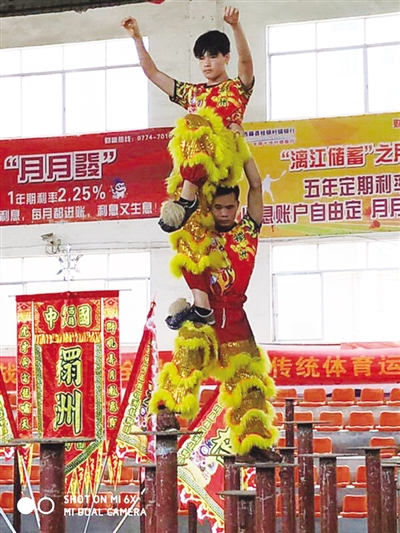 本报讯(记者 梁 晴 实习生 梁小顺 廖宗钰)“锵锵锵咚咚、咚咚锵锵锵......”未见其舞,先闻其势,近日,记者刚刚走近广西藤县体育馆就已经感受到了广西《高桩舞狮》的那股粗犷威武的气势。一进场馆,伴随着锣鼓声,一头狮子跳上高桩,辗转腾挪,做出各种高难度动作,展现着舞狮绝技,令人叫绝。舞狮者一个上弓步、一个上马步、模仿得惟妙惟肖的狮子动作神态,加之打鼓等一系列组合动作的运用,充分地表达出狮子的勇猛、机智的特征。“狮子攀树”“金狮倒挂”“绝壁采灵芝”“探峰攀崖”,舞狮者用高超的技艺将狮子神态、形态表现得淋漓尽致、出神入化,体现出狮子各种神态与形态等特点的相互配合,使整个表演活灵活现,更体现了舞狮者们扎实的基本功。这是即将代表广西出征第十一届全国民族运动会表演项目《高桩舞狮》代表队正在训练中。