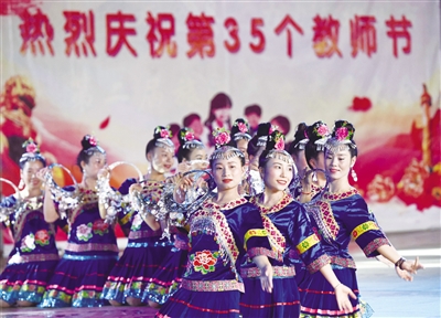 9月10日,三江侗族自治县举行庆祝第35个教师节文艺演出暨“爱在侗乡·江川教育奖”颁奖晚会,师生们以侗族大歌、诗词朗诵、歌舞表演、情景剧及颁奖典礼等多彩形式,纵情欢度教师节,倾情展现侗乡园丁多姿风采。