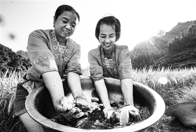 9月5日,在龙胜各族自治县瓢里镇上塘村,村民正在收割稻谷和打捞禾花鱼,田里一片忙碌的景象。