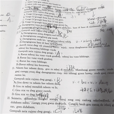仅仅是看还不够,更多的是需要实练,参考书上的每一题都需要去做,在题干里遇到的生词我都记下来,时间久了做选择题的速度也就提上去了。选择题无非就是考察文法结构和《壮文方案》的规则内容,前者的学习需要日积月累,后者实际上在掌握了文法结构后稍加记忆就不再是问题。总的来讲,在学习壮语的过程里,我一直把积累词汇量放在第一位,因为词汇是最基本的一环,词都不懂,句意就更难理解。所以如果我当天有学习壮语的计划,那背词就是必需的项目之一。一开始的计划是每次抽出时间背80个单词,后来加到100个。我背单词并不是一个一个磨,而是大体地把这页单词先全部浏览一遍,再每个单词细读一遍,最后再着手抄写记忆。每次背词都会把之前的背过的词再过滤一遍。在这个过程中,我发现一词多义的壮语词非常多,单音节词更是记忆的难点,一般遇到这类词就专门抽时间记忆,有时候个别词之间出现混淆也是常有的情况。针对这些问题,我能给到的建议只有常背常记。