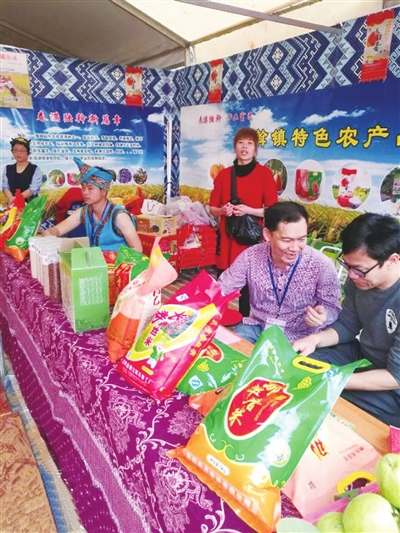 ▲那羊特色香米系列产品在三月三歌圩上展示。图中右二为驻村干部、“广西民族团结先进个人”“广西优秀第一书记”秦培钊。