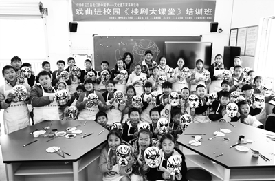 12月19日,由柳州市群众艺术馆牵头主办的2019年“我们的中国梦”——文化进万家系列活动戏曲进校园《桂剧大课堂》培训班走进三江侗族自治县古宜镇中心校大洲校区,培训老师通过向学生介绍桂剧常识和指导学生绘制脸谱等形式,让侗乡学子零距离感受戏曲的独特魅力。图为学生们在展示自己绘制的脸谱。(龚普康)
