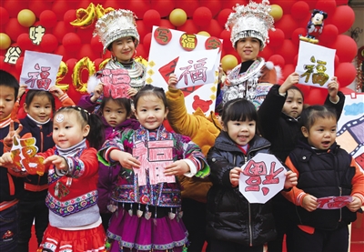 2019年12月31日,柳州市融水苗族自治县小红帽幼儿园举行“传统民俗味,欢乐中国年”庆元旦迎新年活动,孩子们在芦笙踩堂、舞龙和剪(填)“福”字等民俗活动中喜迎新年到来。