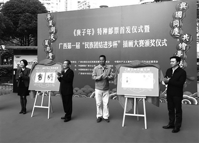 本报讯(记者 黄浩云) 1月5日,由自治区民宗委、共青团广西区委指导,中国邮政集团公司广西区分公司、广西民族出版社、广西集邮协会主办,中国邮政集团公司南宁市分公司、南宁市集邮协会承办的“子鼠开天 鼠兆丰年”《庚子年》特种邮票首发暨“与国同庆 共绘梦想”广西第一届“民族团结进步”杯插画大赛颁奖仪式在南宁市举行。自治区第十二届人大常委会副主任、广西集邮协会名誉会长高雄,自治区民宗委党组成员、副主任沈永明,共青团广西区委副书记廖长友,中国邮政集团公司广西分公司副总经理、广西集邮协会会长罗燕等领导和嘉宾出席了发布会。