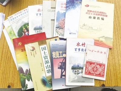 谢庆良家中,珍藏着许多山歌集和山歌手稿,有宣传民族政策的,有宣传《未成年人保护法》《劳动法》的,有农民工维权的……找他写时政山歌的人越来越多,即使没有酬劳,他也会努力编写,有时候在田里干着农活,脑子里还在思考怎么编山歌,谢庆良说:“用山歌的方式宣传政策,老百姓爱听,宣传效果也好。”