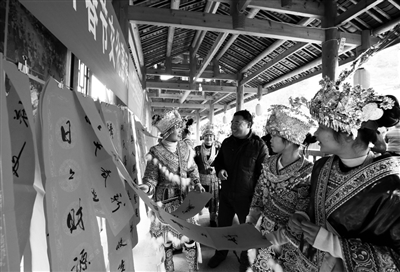 1月13日,融安县长安镇安宁村大袍苗寨载歌载舞、锣鼓喧天,由自治区扶贫办、广西广播电视台联合主办的“克难攻坚·决胜小康——2020年文化扶贫下乡巡回演出活动”在这里举行。当日,来自融安县书法艺术界的名家们在县文联的组织下,来到大袍苗寨给当地苗族群众赠送春联。书法家们现场书写了近千幅春联,全部赠送给苗寨群众,给苗族同胞送上了一份新春的贺礼。