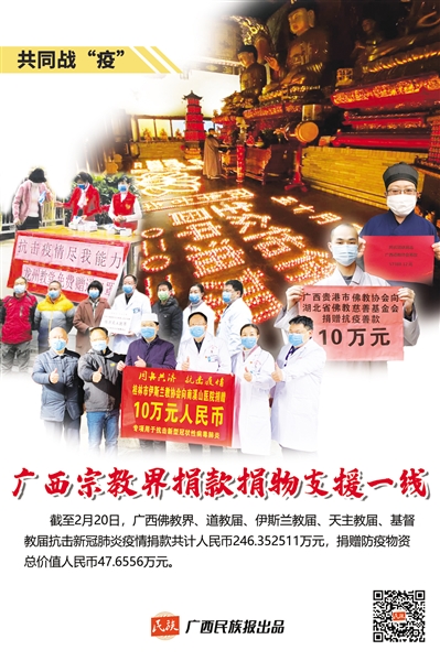 近期,新冠肺炎疫情牵动着全国人民的心。疫情发生以后,自治区民宗委及时发出致全区宗教团体、宗教活动场所应对疫情的一封信《同舟共济、共克时艰坚决打赢疫情防控阻击战》,得到广西宗教界积极响应。1月29日,自治区五大宗教团体联合发出《广西宗教界同心助力打赢疫情防控阻击战倡议书》,号召全区各宗教团体、宗教活动场所、宗教教职人员和信教群众进一步凝心聚力,积极参与疫情防控工作,有钱出钱,有力出力,为打赢疫情防控阻击战贡献广西宗教界的力量。据统计,截至2月20日10:00,全区宗教界累计捐赠善款246.352511万元,物资47.6556万元。其中佛教界捐款152.06803万元,口罩、测温仪、护目镜、消毒液、中药剂、牛奶、八宝粥等物资25.0755万元;道教界捐款5.81万元,口罩等物资5.7621万元;伊斯兰教界捐款12.31万元,口罩、生活食品等物资9.75万元;天主教界捐款5.6606万元,消毒液、口罩、医用帽子等物资7.068万元;基督教界捐款61.058581万元。目前所有款项和捐赠物品已到位。