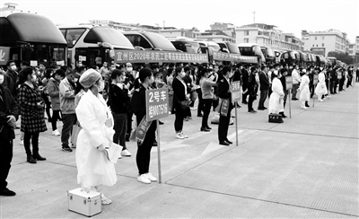 为切实保障复工人员安全、顺利、有序返岗就业,3月1日,“2020年农民工赴粤返岗就业服务活动启动仪式”在宜州区汽车客运总站举行,188名务工人员乘坐10辆“专车”返岗复工。