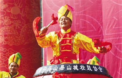 南宁市马山县是“中国会鼓之乡”,乡里的“鼓王”韦建廷特别善于做打鼓总指挥,其举手投足皆是力和舞的结合——或如猛虎下山之雄健,或如出水蛟龙之夭矫,或如灵猴跳枝之轻巧,或如鹰隼扑兔之迅捷。而鼓声随着他的指挥,开始时鼓声轻缓如春溪出山,姗姗,潺潺;接着渐变疾急迅猛,鼓声便如惊涛拍岸,洪波决堤,泰山极顶惊雷频作,钱塘怒潮狂卷,九天扶摇抟风怒吼;最后,大地震颤,千山震撼,人心震动……韦建廷是广西壮族自治区非物质文化遗产名录项目“壮族会鼓”代表性传承人和广西民族传统体育项目“壮族会鼓”代表性传承人。痴迷会鼓50多年,他将壮族会鼓带到了上海世博会等地,让世界人民领略到壮乡独具特色的民族文化魅力。现在,韦建廷是马山县民族中学、城西小学、大同小学、造华小学4所中小学校壮族会鼓课的老师,竭尽全力传承壮族会鼓千年雄风。