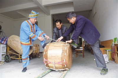 当然,蒙鼓用的牛皮也需用心选取。好鼓的鼓面皆选自大母牛的脊皮,厚而韧,不易受潮汲湿,不松弛,鼓声不瘖哑变声。就连小小的鼓槌,也全采自岩缝中的“斧柄木”,坚硬愈铁,唯穆柯寨的“降龙木”可与之作比。用这种槌击鼓,其声如金石之声,铿锵而厚重。