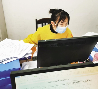 疫情发生之初,她将一岁大的女儿托付给老人,主动请缨加入疫情防控领导小组办公室。每天,她最早到办公室,查看新收文件、收集各类人员信息表,草拟疫情相关工作报告、印发文件、电话核实公安部门反馈重点人员信息、整理疫情防控工作档案。为上级做疫情防控决策提供强有力的信息支撑,为了一份统计表,她打电话逐个核实信息,与同事多次检查无误后再上报。