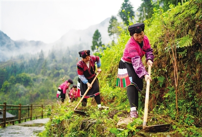 3月17日,在龙胜各族自治县泗水乡布尼梯田景区,红瑶群众在旅游步道旁种植映山红树苗,为花海梯田增添一抹色彩。近期,在做好新冠肺炎疫情防控工作的基础上,该县积极引导景区内群众复耕、复产,帮助旅游行业纾困解难、有序复工,推动旅游市场复兴,发挥旅游在脱贫攻坚中的重要作用。