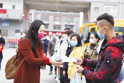 图为梁潇丽(左一)给返程务工人员分发防护口罩。