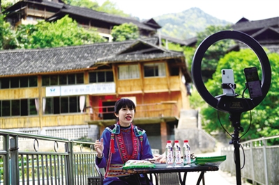 4月14日,在龙胜各族自治县江底乡城岭村,扶贫工作分队长何平通过直播向网友展示当地养殖的凤鸡。
