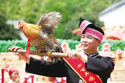大化壮、瑶民族的宗教习俗与鸡关系密切。瑶族祭祀土地神的《土地歌》唱道:“鸡禄为土地,鸡子磊磊得成群。”壮、瑶家庭的祭祀、占卜、丧葬、择吉辰等,都少不了鸡,用公鸡还是母鸡也有严格区分,因为它们各自表达不同的内容和愿望。比如壮族安神龛,要用活着的公鸡,表达吉祥的愿望,又以道公咬鸡冠出血表示避邪,且过后养至其自然死去,寓意平安;鸡在婚俗中也寄托吉祥如意、美满幸福的祝愿;在酒中滴鸡血盟誓,一饮而尽,表示亲如手足,有福同享,有难同当,友谊长久。