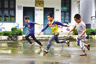 图2为5月11日,周起阳(中)、周起航(右)和同学叶家勋在课间一起玩转铁圈。