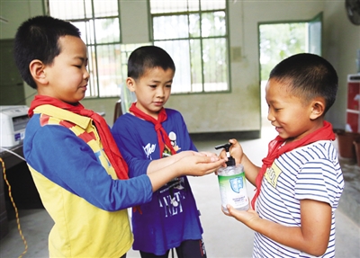 图3为5月11日,周起航(右)为堂哥周起阳挤免洗净手凝胶。