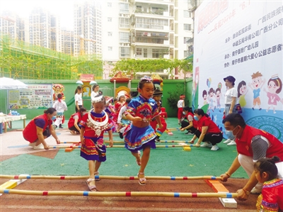 6月1日上午,由自治区民宗委、广西民族报社、中建五局华南公司广西分公司、南宁市青年志愿者协会主办,南宁面粉厂幼儿园承办,南宁市星期六爱心公益志愿者协会、南宁市蓝天救援志愿者协会等协办的“民族团结一家亲·小手拉大手”庆祝2020年“六一”国际儿童节联欢活动在南宁面粉厂幼儿园举办。嘉宾、志愿者和幼儿园的壮、汉、侗、苗等民族的小朋友共20余人欢聚在一起,用优美的民族舞蹈、甜美的歌声、有趣的小游戏共同庆祝儿童节。