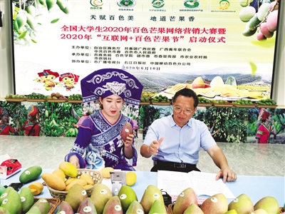 6月10日,全国大学生2020年百色芒果网络营销大赛暨2020年“互联网+百色芒果节”启动仪式举行,百色市委常委、常务副市长石国怀与网络主播通过网络媒体、电商平台直播“带货”,为百色芒果“吆喝”,并邀请各地大学生共同参与到百色芒果网络营销大赛中。
