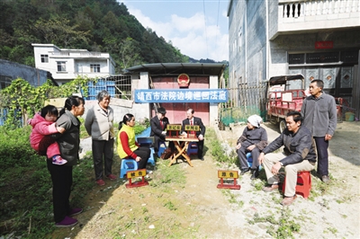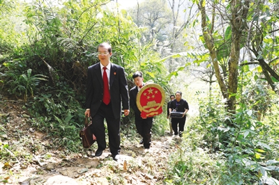 尊重边民的民族风俗习惯,从语言、风俗习惯入手,充分利用司法联调的有利条件,用老百姓易于接受的方法,解决边民的矛盾纠纷,促进边境群众按照各种风俗习惯和谐相处。在边民卢姆明家事纠纷案件中,当事人卢姆明已77岁高龄,且腿脚行动不方便,如果调解不到位极易引起家庭矛盾恶化。巡回法庭工作人员带着一枚国徽、一条横幅、一张方桌、一台电脑、一部警车,不到一个小时就到达了卢姆明家,并在农家小院里挂起国徽就地审案。员额法官使用本地壮话方言,耐心细致地解说法律知识,围绕争议焦点,结合当地风俗民情调解纠纷,最终使双方自愿达成了调解协议,一家人继续和睦地生活。原告表示,“巡回法官来到我家门口帮调解案件,感到很方便,也很满意,感谢法官们。”巡回法庭在农家小院审理家事案件,也给村里的群众上了一堂法治课,以鲜活的案件进行以案释法,达到了“审理一案教育一片”的目的。