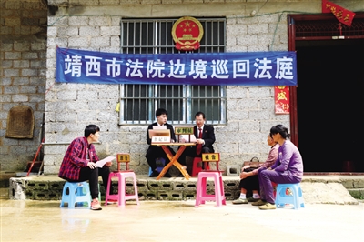 为维护边境社会和谐稳定,促进边贸繁荣发展,2017年以来,靖西市人民法院不断探索多元化机制,设立边境巡回法庭解决边境群众矛盾纠纷。靖西法院边境巡回法庭作为中越边境线上移动的法庭,采取“五个一”工作法即一呼即应、一钟到达、一套流程、一腔热诚、一定满意,积极化解边境民事纠纷,促进边民和谐,为维护边疆和谐稳定,促进边贸互市发展提供有力的司法保障和高效的司法服务。