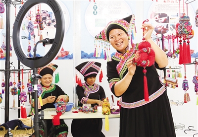 6月23日,在百色市右江区“壮族麽乜”福禄制作基地,手工艺人加紧制作壮族民间传统工艺品“麽乜”并通过网络直播向外推介。