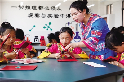 7月6日,在罗城仫佬族自治县易地扶贫搬迁安置区“仫佬家园”罗城·深圳实验小学,学生在教师指导下学习自治区级非物质文化遗产仫佬族剪纸。