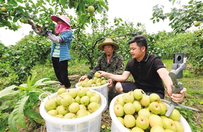 盛夏时节,柳州市柳城县龙头镇贫困村旗山村下里屯的果园里,个头均匀的青花梨挂满枝头,甚是喜人。今年,当地群众发展种植的100亩青花梨有70亩挂果丰收,总产量约10万公斤,按照目前市场价格4元/公斤计算,预计产值可达40万元。