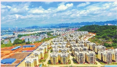 吉祥小镇是平果市最大的易地扶贫搬迁安置点,规划用地面积285.07亩,总建筑面积24.85万m2,住宅面积为20.92万m2,建设有54栋住宅楼,2298套安置房。安置点还配套建设10栋两层的商业用房。目前,吉祥小镇已安置易地扶贫搬迁贫困户2298户9688人。搬迁后,贫困户的生产生活环境得到了极大改善。吉祥小镇通过安排贫困群众就近就地就业、创业或发展产业,保证贫困群众有稳定持续的收入,确保了贫困群众实现“搬得出、稳得住、有事做、能致富”的目标。图为吉祥小镇航拍图。(通讯员 覃蔚峰 摄)