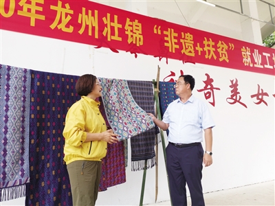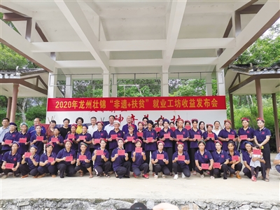 广西文化和旅游厅非遗处处长周建洪在该收益发布会上表示,龙州壮锦“非遗+扶贫”就业工坊以文化扶贫助力脱贫攻坚、乡村振兴,使就业工坊跟着乡亲走,乡亲跟着扶贫产业项目走,产业项目跟着市场走,体现了精准扶贫中的“非遗”力量,在“设计+市场”方面形成了“广西经验”,成果显著。2018年6月,龙州壮锦技艺工坊成为国家文化和旅游部、国务院扶贫办支持的全国首批“非遗+扶贫”就业工坊(注:全国仅有10个),“在家织锦、居家创收”模式成为54户村民(其中贫困户18户)增收脱贫致富的“金钥匙”。