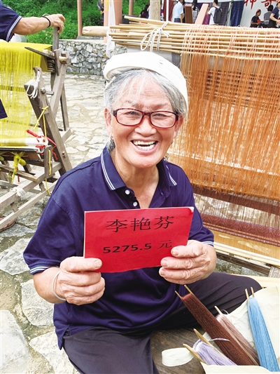 “今年第二季,我领到6166元收益金啦!” 今年48岁的织娘沈秀荣本季的织锦收益排名第一,从崇左市委常委、龙州县委书记秦昆手上领过收益款,她笑吟吟地说。8月17日下午,2020年龙州壮锦“非遗+扶贫”就业工坊收益发布会在崇左市龙州县金龙镇双蒙村板池屯举行,47名“居家就业”的织娘共领到广西织绣发展研究会派发的14.7万元收益金,75岁的李艳芬以5275.5元收益金获得第二名,李美艳以4278.5元收益金获得第三名,屯里洋溢着丰收的喜悦。