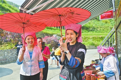 9月2日,桂林市龙胜各族自治县龙脊镇马海村举行“晒秋”活动。村民们利用窗台、屋顶、晒台铺晒丰收的农作物。火红的辣椒、金黄的玉米把当地壮族杆栏式建筑群装点成一幅唯美的丰收画卷。当天的活动还包括民俗巡游、农产品展销、民族特色文化展示等内容。晒秋活动通过网络直播、主播带货、电商平台销售等方式,拓宽农产品销售渠道,进一步助推全域旅游发展,汇聚起脱贫攻坚、实施乡村振兴战略、全面建成小康社会的力量。龙脊辣椒是龙胜特产,2013年获批国家农产品地理标志。图为龙胜“网红扶贫队长”何平(右)通过多个直播平台宣传销售辣椒等马海特产,直播不到半小时就售出30多盒辣椒。