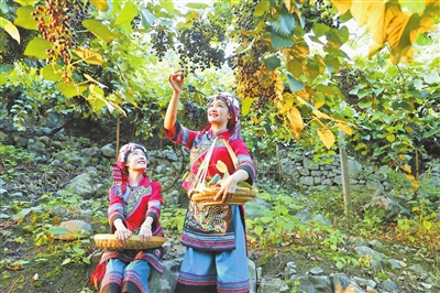 8月26日,在罗城仫佬族自治县四把镇里乐村拉任屯,仫佬族姑娘忙着摘收成熟的毛葡萄。