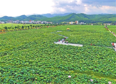 我们一行驱车从贵港市区出发,沿高速路往西北行二十余公里,来到号称“荷美覃塘”的莲藕产业核心示范区。刚驶入景区,远远地就看见窗外一大片广阔的田野,被一层墨绿色的植被所浸染。当天恰逢周末,大客车刚进入景区便被熙熙攘攘的游客迟滞在路上。