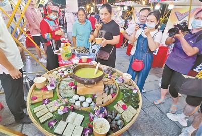 图为9月8日晚,在南宁市三街两巷步行街,市民被众多的广西非遗美食所吸引。