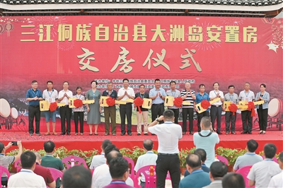 9月10日,三江侗族自治县举行大洲岛安置房交房仪式,标志着三江大洲岛安置房项目全面完工,也标志着大洲岛安置群众进一步迈向美好幸福生活。柳州市委副书记梁旭辉宣布安置房正式交付入住,县委书记邝驱参加仪式并致辞。