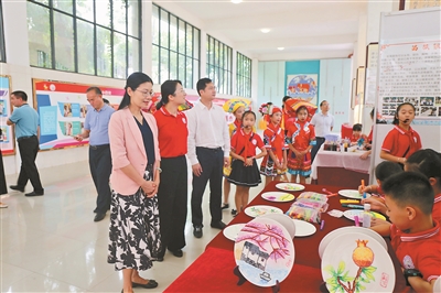 南宁市委常委、统战部部长严丽萍在文艺展演开始前对活动的举行表示祝贺,鼓励大家奋力谱写民族团结进步事业新篇章,并向师生们送上国庆中秋双节的祝福。随后,文艺表演在开场节目民族舞《板凳龙》中拉开序幕。当天,校园一角还举行了形式多样的学生兴趣才艺展示活动。皮影戏小舞台、扎染创作、瓷盘手工画、3D绘画、3D建模打印等丰富的才艺展示让领导及嘉宾们对孩子们的创造力赞不绝口。