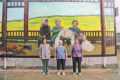 “这幅画画的就是我,画里面是我和姐妹们在凉亭里聊天,孙女在身边嬉戏。现在,我们村里有花圃、凉亭、活动场所……老年人的生活很安逸。现在我们村都出名了,因为这些画我们几个老太婆也都成了模特了。”70多岁的村民翟志英笑得合不嘴。