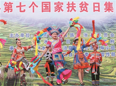 ▶10月17日,融水苗族自治县开展第7个国家扶贫日集中宣传活动。活动通过歌舞表演、三句半、小品、山歌以及发放资料、政策解答及农产品展示等形式,宣传扶贫惠民政策,展示脱贫攻坚以来取得的成就。