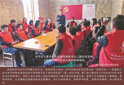在我国第7个扶贫日、第28个国际消除贫困日到来之际,10月16日至18日,来自黔桂两省区的30余位诗人、作家走进贵州少数民族地区毕节市大方县和七星关区,开展“乌蒙见证”——全国诗人助力脱贫攻坚诗歌创作采风活动,诗人、作家们深入乡村,住在乡村,通过实地走访调研,聆听英雄故事,感受愚公精神,体验脱贫成果,诗写崭新的时代和勤劳的人民。