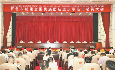 百色市坚持以习近平新时代中国特色社会主义思想为指导,深入贯彻落实习近平总书记关于民族工作的重要论述,以“铸牢中华民族共同体意识”为主线,紧扣“中华民族一家亲,同心共筑中国梦”总目标,围绕“共同团结奋斗,共同繁荣发展”的主题,全面深入持久开展民族团结进步创建工作。今年市委市政府主动请缨,申请创建全国民族团结进步示范市,并高规格召开创建动员大会部署相关工作。全市迅速行动、贯彻落实,全面铺开创建工作,呈现出新一轮民族团结进步创建工作新热潮,掀起人人参与民族团结进步创建工作新局面,创建全国民族团结进步示范市工作开局良好并取得阶段性成效。