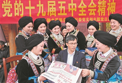 10月31日,融水苗族自治县纪委监委组成宣讲小分队,深入该县同练瑶族乡,通过发放资料、现场宣讲、板报展示等形式,宣讲党的十九届五中全会的新政策、新气象、新成就和“十四五”规划及2035年远景目标,深受苗族群众欢迎。(通讯员 龙林智)